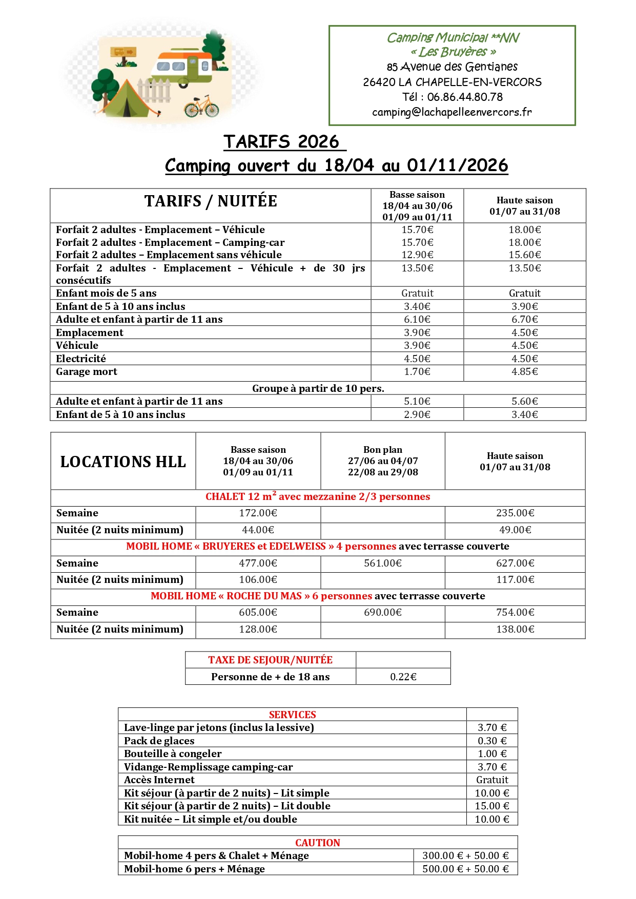 OUVERTURE DU CAMPING DU 18 avril au 01 novembre 2026